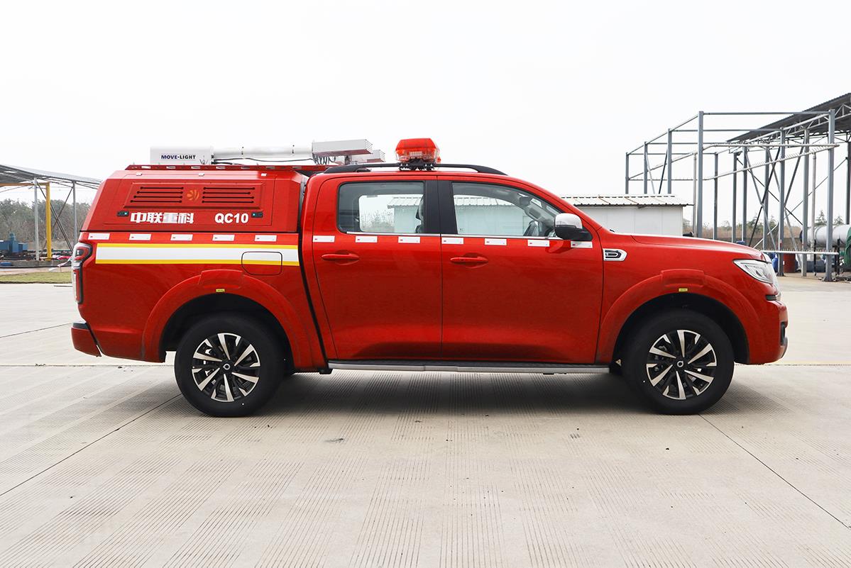 QC10A6型“平戰(zhàn)接合型”前突皮卡車,在救援隊(duì)伍行進(jìn)時(shí),起突前器材運(yùn)輸作用,用于搭載救援人員和消防器材快速到達(dá)事故現(xiàn)場(chǎng)。
